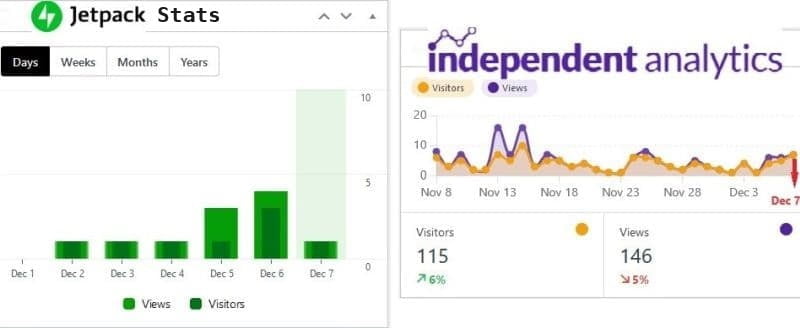 Jetpack Stats and Independent Analytics both have advantages, but over the year of using the free Independent Analytics plugin I found their stats to be more concise & accurate.