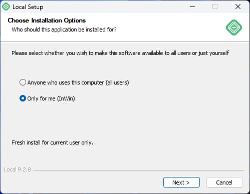 Select “Only for me” unless multiple users on your computer need access to Local.
