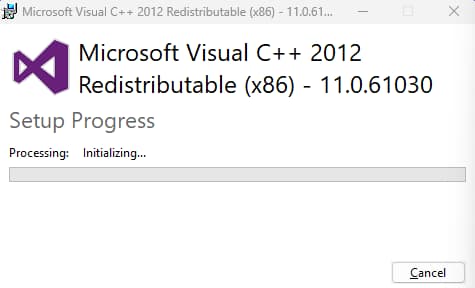If installation appears frozen at “Initializing,” wait 5-10 minutes. The Visual C++ installation sometimes pauses without showing progress.