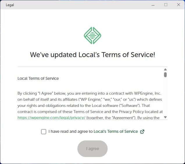 Local opens with Terms of Service. Check the box and click “I Agree.”