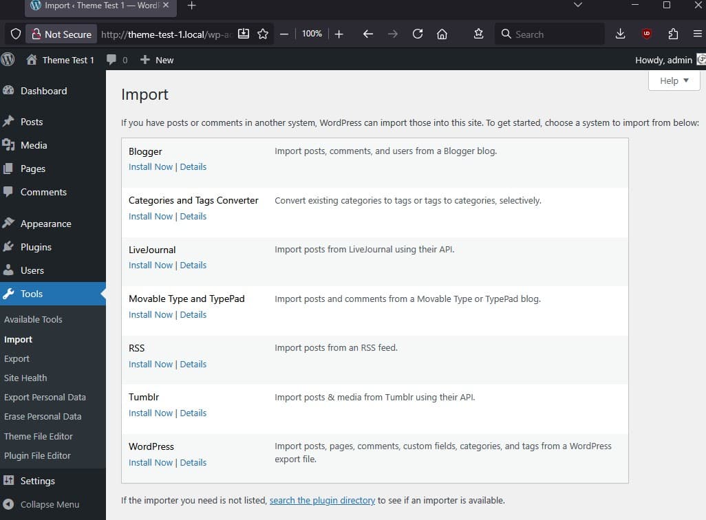 You’ll see a list of importer tools for different platforms. Scroll down to WordPress and click Install Now. This adds the official WordPress Importer plugin, which you’ll use to bring in your content.