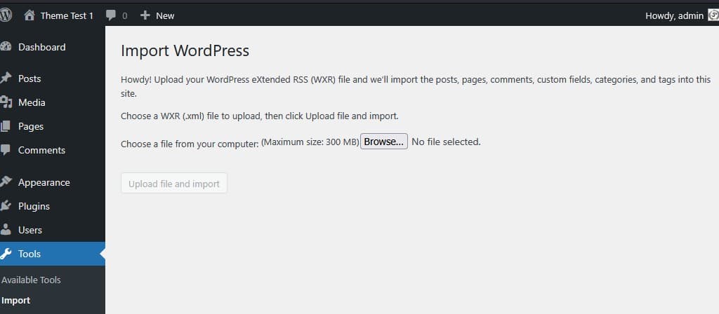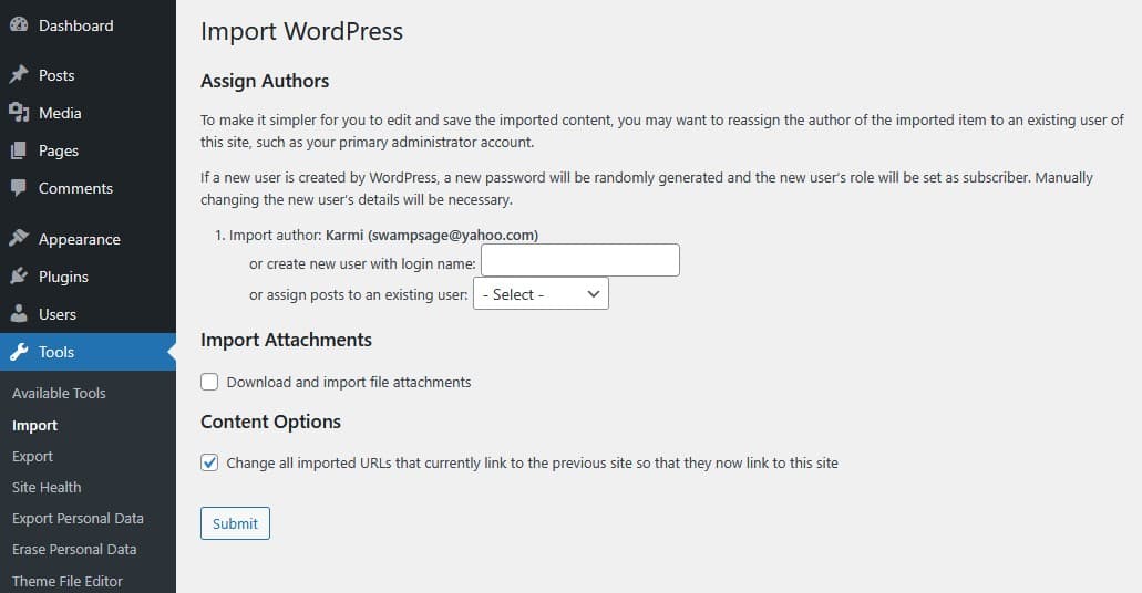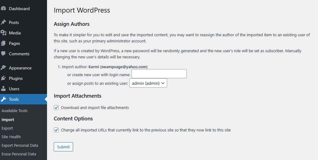 Click Upload file and import. When prompted, you’ll see options to assign posts and import attachments. Choose your existing admin user as the post author.