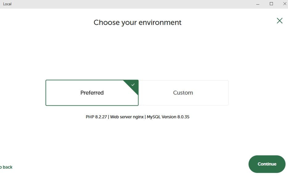 Next, you’ll choose your environment. Local will show two options, Preferred and Custom. Go with Preferred — it’s ready to use, fast to set up, and perfect for theme testing. (Custom is mainly for developers who need to match a specific PHP or MySQL version.)