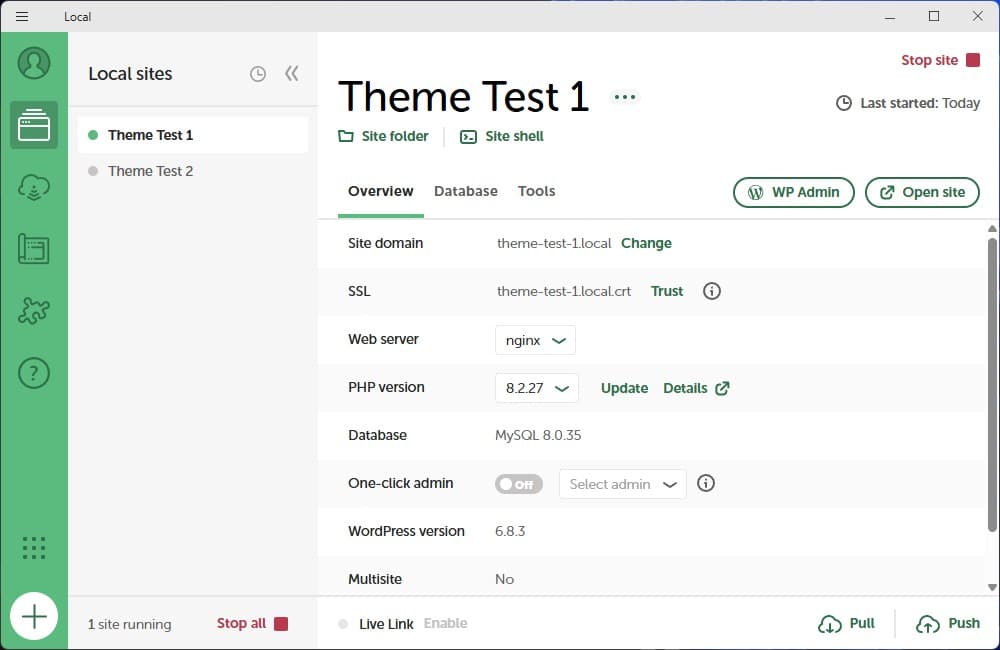 Once Local reports your site is ready, you now have a safe, local environment — a complete WordPress installation running privately on your system, ready to import your real content in the next step of your WordPress theme migration.