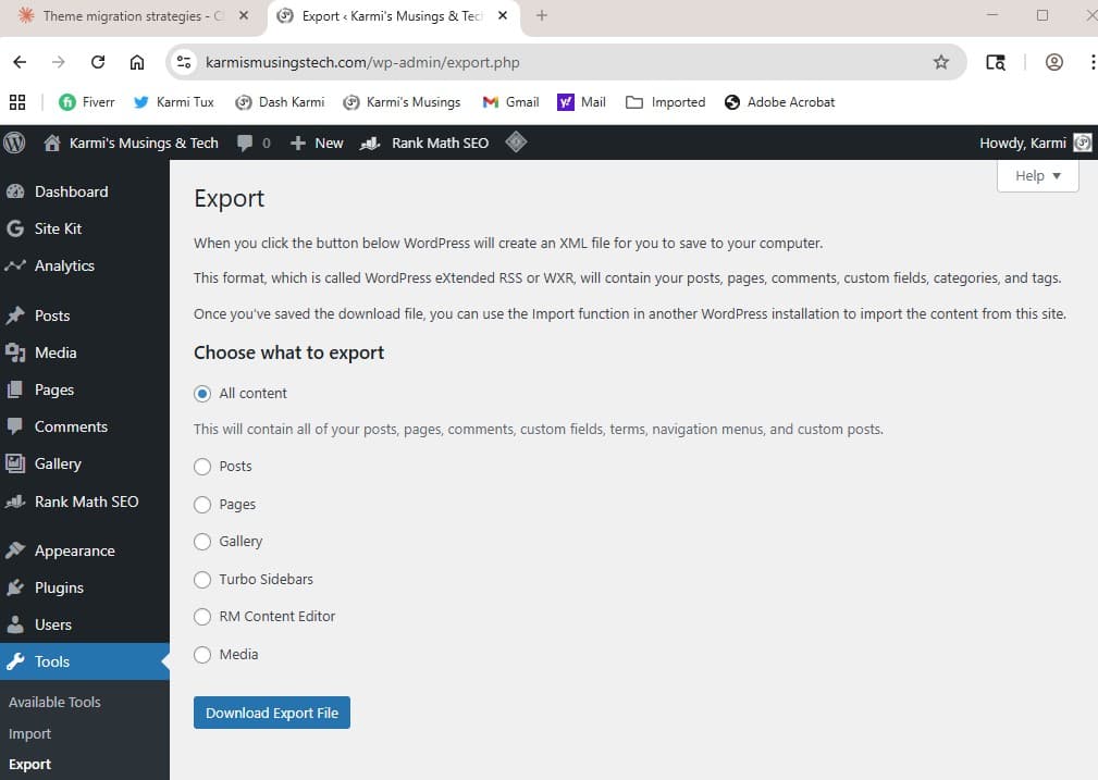 With your Local test site ready, it’s time to bring in your real posts, pages, and media. This is a simple export from your live WordPress site — no changes, no risk. You’re just making a copy to use during your WordPress theme migration.