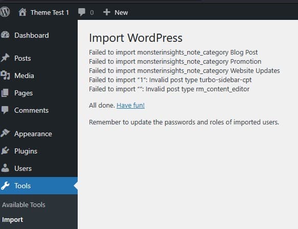 Before you add the new theme, check that your content import finished successfully. If you see a few notices like “Failed to import monsterinsights_note_category” or “Invalid post type turbo-sidebar-cpt”, don’t worry — those simply refer to plugin data or custom post types that aren’t active in your Local setup.