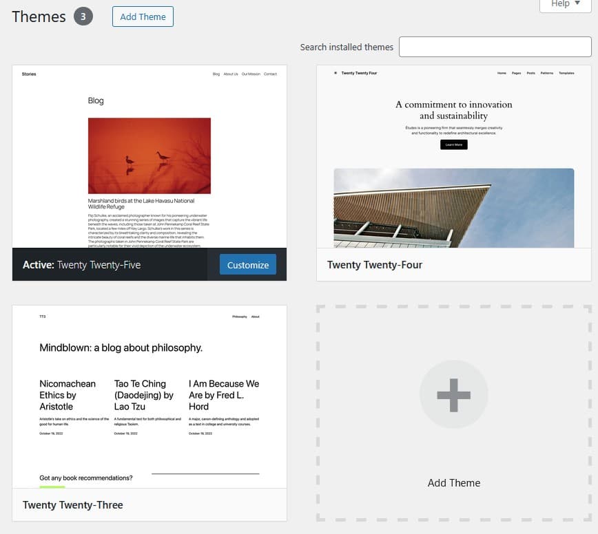 In your WordPress Admin Dashboard, select Appearance → Themes. You’ll see the default WordPress theme (usually Twenty Twenty-Five) active on your Local site.