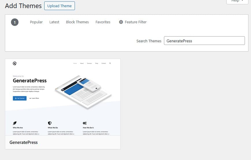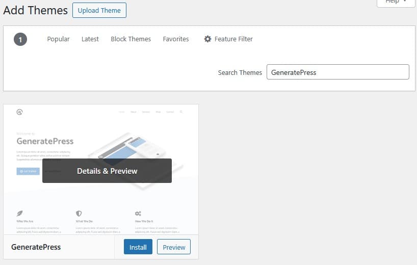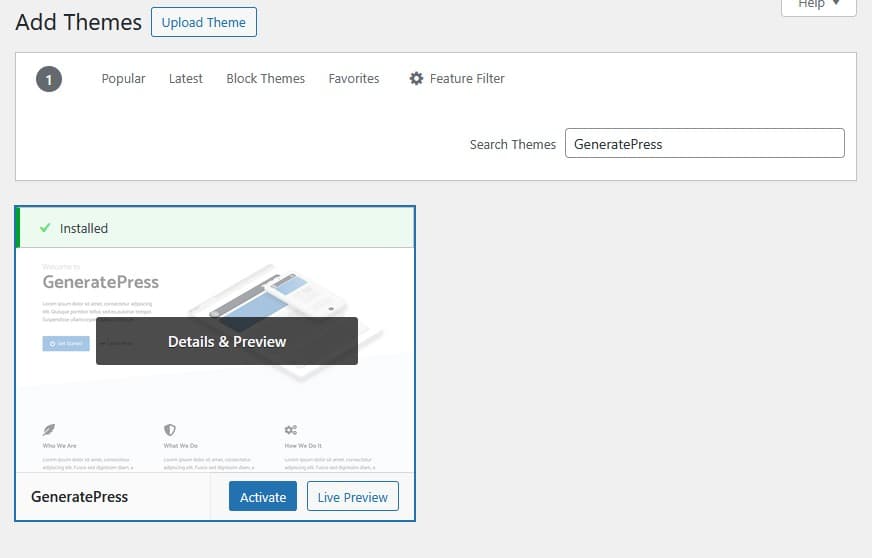 Hover over the GeneratePress card to reveal the Install button, then click Install. Once installation completes, click Activate to make it your current theme.