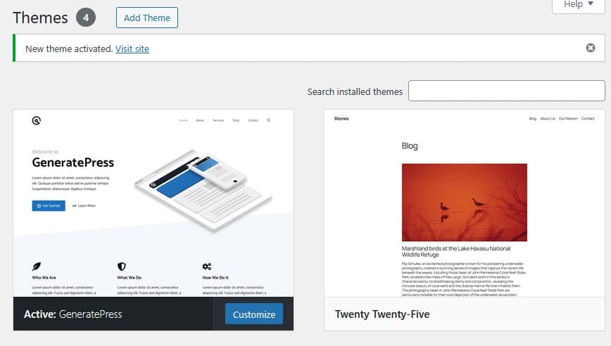 When activation finishes, GeneratePress appears as the active theme at the top of your Themes page.