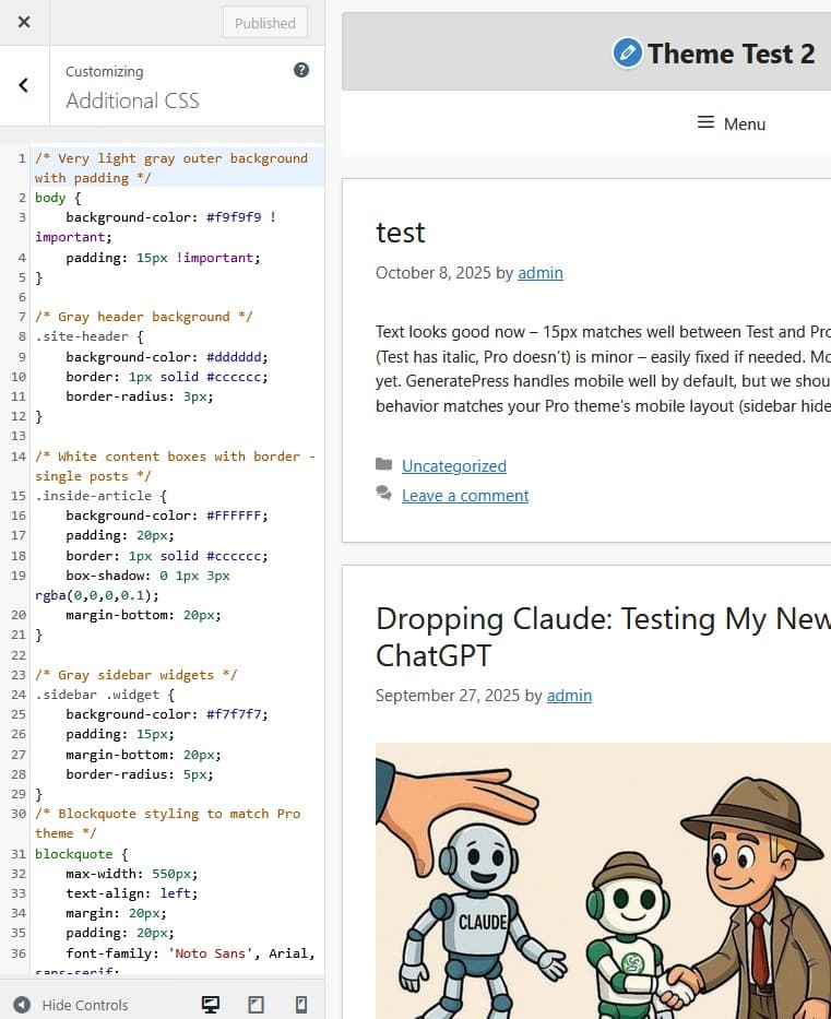 This is also where AI can be surprisingly helpful again. You can describe what you see (“my sidebar is too narrow on mobile” or “my blockquote text is off-center”), and ask ChatGPT or Claude for a short CSS rule to fix it. Test it in Local first, and keep notes on what you change.