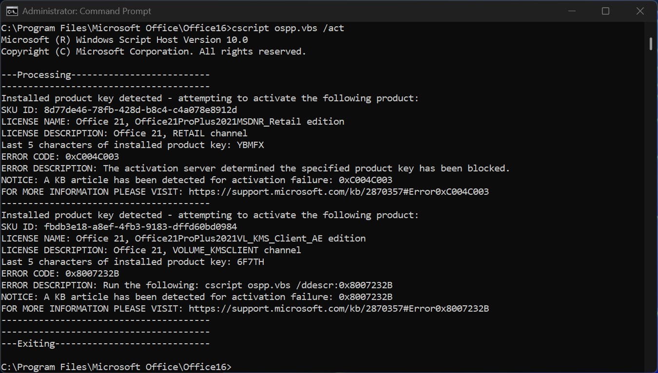If a key fails, the script output will display the error code, license channel, and product ID—evidence Microsoft support accepts in disputes or ticket logs.