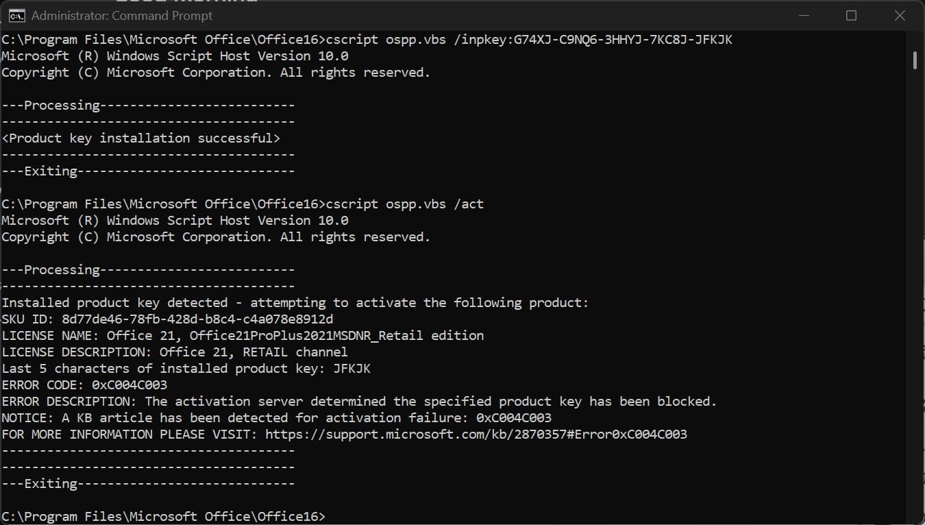 • CMD shows installation, then error 0xC004C003. This means Microsoft’s servers have already blocked the key—often because it’s resold or no longer valid.