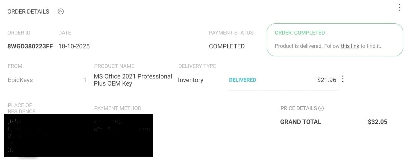 Order details confirmation for MS Office 2021 Professional Plus OEM Key with a total of $32.05 from EpicKeys.