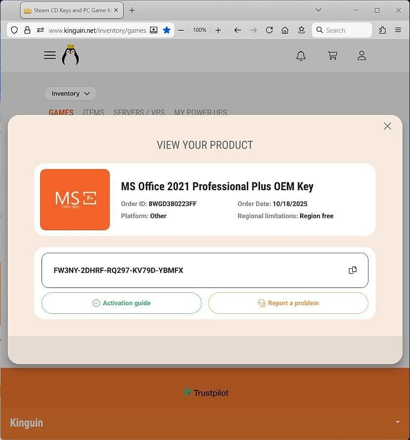 After days of blocked keys and circular support, I finally got tired of waiting for Kinguin to make things right and decided to buy from TechRepublic instead. Their purchase process was transparent from the start, and activation took only minutes—no commands, no phone calls, no red error screens.