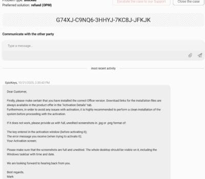 Below are key screenshots and error logs that document the activation troubles—and the support requests that followed—with Kinguin’s Office 2021 product key.