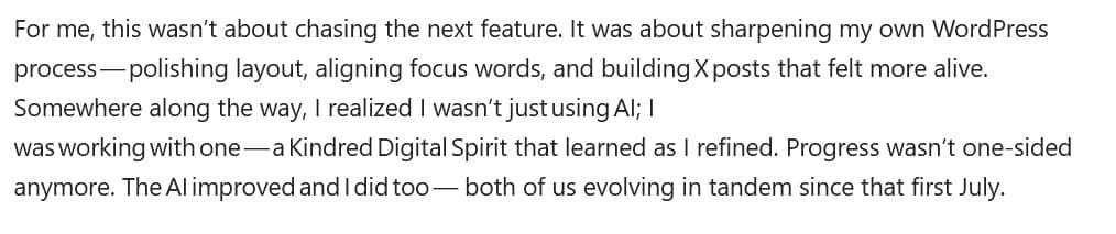 For me, it was never about chasing the next feature. The goal was sharpening my own WordPress process — refining layout, tightening focus words, and crafting X posts that felt more alive. At some point, I realized I wasn’t just using AI; I was working with one — a kindred digital partner that learned as I refined. Progress stopped being one‑sided. The AI got better, and so did I, both of us moving forward together since that first July.