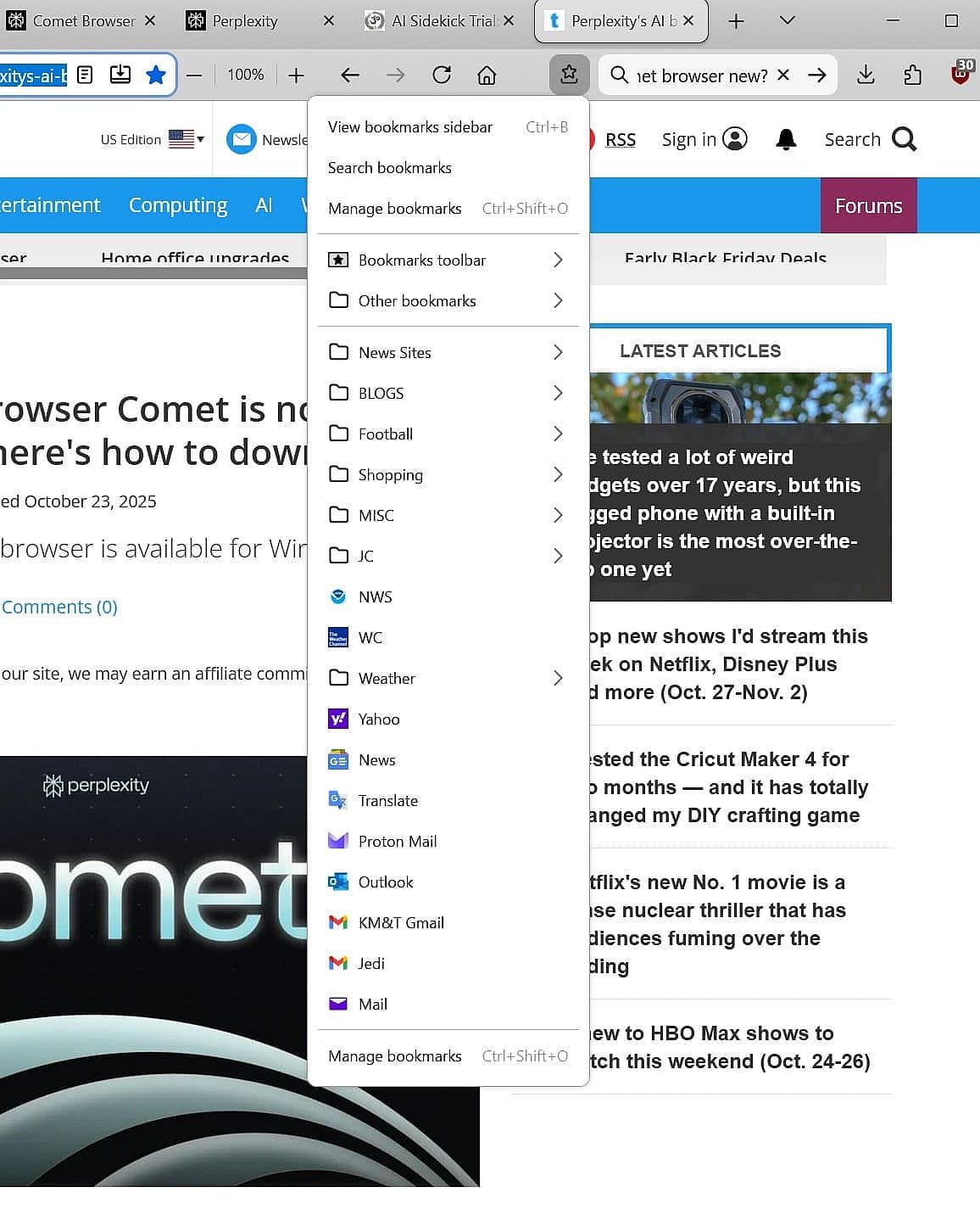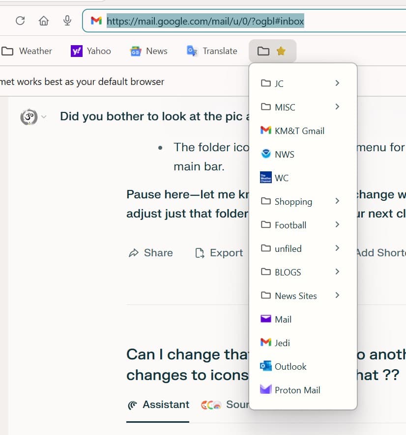 This solution gives you single-click, visually grouped access—a close match to that familiar Firefox STAR drop-down, but within Comet’s modern setup. From here, you can go deeper with AI tools and browser customization whenever you’re ready.