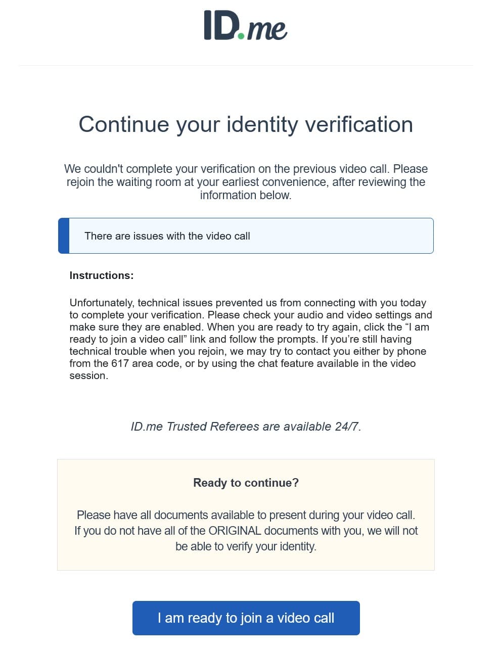 When that automated selfie step failed, ID.me escalated me to a live video call with a “trusted referee.” On paper that sounds simple, but my main PC doesn’t even have a camera or microphone, and I had never done a real video call on the phone, so I sat there not knowing what to click or which device they expected me to use. The first call attempt fizzled out, and ID.me sent me a follow‑up email inviting me to “rejoin the waiting room” for a second try—complete with a warning to have all the original documents ready to hold up to the camera.
