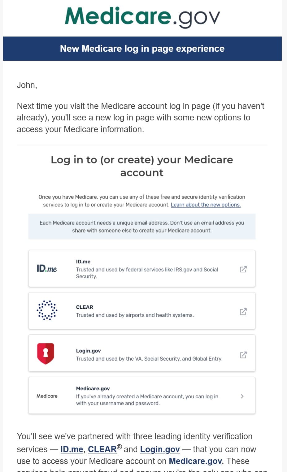 By the time Medicare’s new log‑in email landed in my inbox, I was already sitting on three separate registrations: an older Medicare.gov account, an ID.me account from some past federal need, and that forgotten Login.gov account. When I clicked over to Medicare.gov, my old username and password no longer worked, and the new screen greeted me with four big buttons—ID.me at the top, then CLEAR, Login.gov, and Medicare.gov at the bottom.